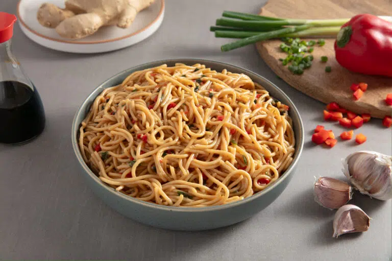 COOKED ENRICHED MACARONI PRODUCT (WATER, SEMOLINA [WHEAT], NIACIN, FERROUS SULFATE, THIAMIN MONONITRATE, RIBOFLAVIN, FOLIC ACID), RICE VINEGAR, SOY SAUCE (WATER, SOYBEANS, WHEAT, SALT), SOYBEAN OIL, RED BELL PEPPERS, SUGAR, GREEN ONIONS, CONTAINS LESS THAN 2% OF GARLIC, SESAME OIL, SPICES, POTASSIUM SORBATE (TO PREVENT SPOILAGE), XANTHAN GUM.