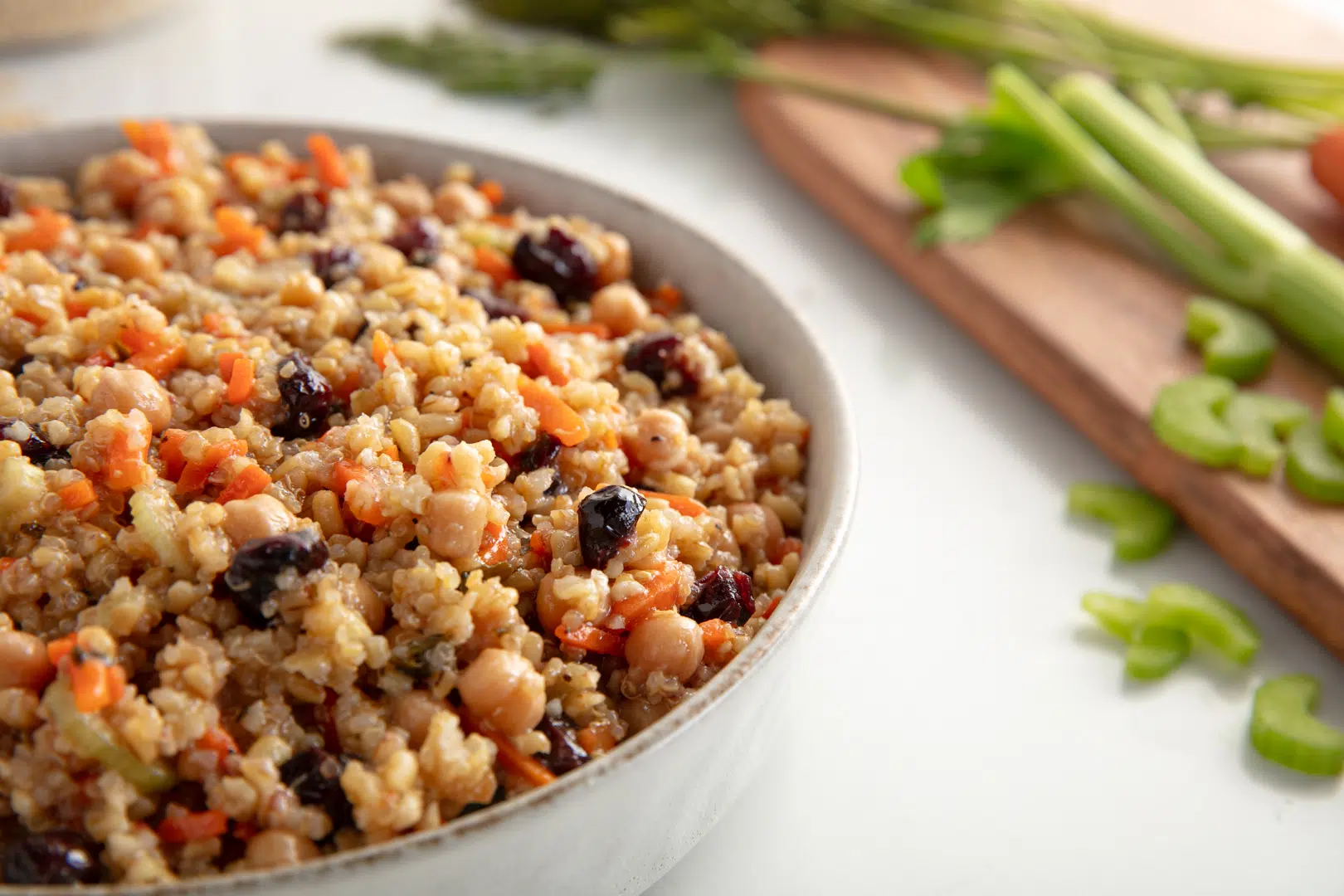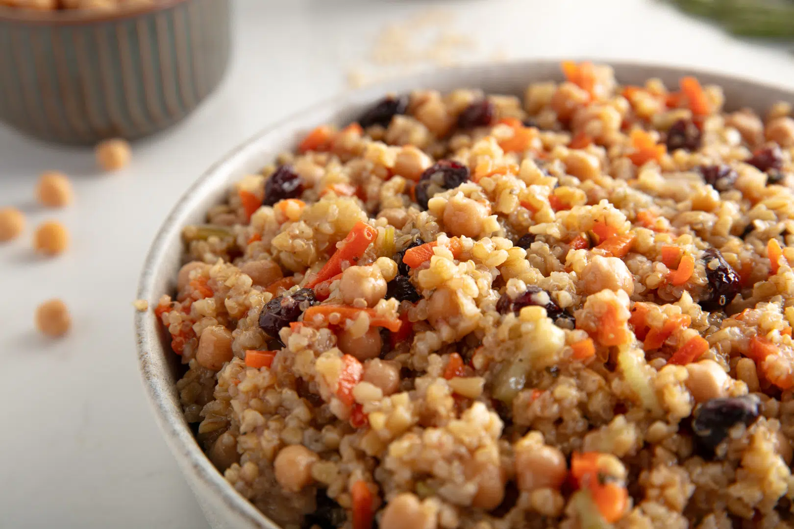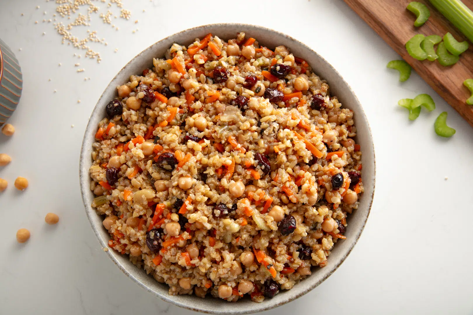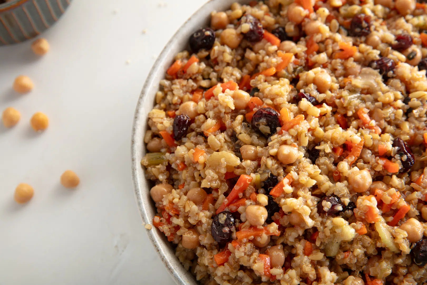 WATER, CHICKPEAS, BULGUR WHEAT, APPLE CIDER VINEGAR, CARROTS, SOYBEAN OIL, SWEETENED DRIED CRANBERRIES (CRANBERRIES, SUGAR, SUNFLOWER OIL), QUINOA, CELERY, SUGAR, CONTAINS LESS THAN 2% OF HONEY, KALE, VEGETABLE BASE (COOKED VEGETABLES [CARROT, ONION, CELERY], SALT, SUGAR, CORN OIL, POTATO FLOUR, NATURAL FLAVOR, MAL TODEXTRIN, CARROT POWDER), BROWN SUGAR (SUGAR, INVERT SUGAR, MOLASSES), MOLASSES, SALT, DIJON MUSTARD (DISTILLED VINEGAR, WATER, MUSTARD SEED, SALT, WHITE WINE, CITRIC ACID, TARTARIC ACID, SPICES), POTASSIUM SORBATE (TO PREVENT SPOILAGE), SPICES, XANTHAN GUM.
