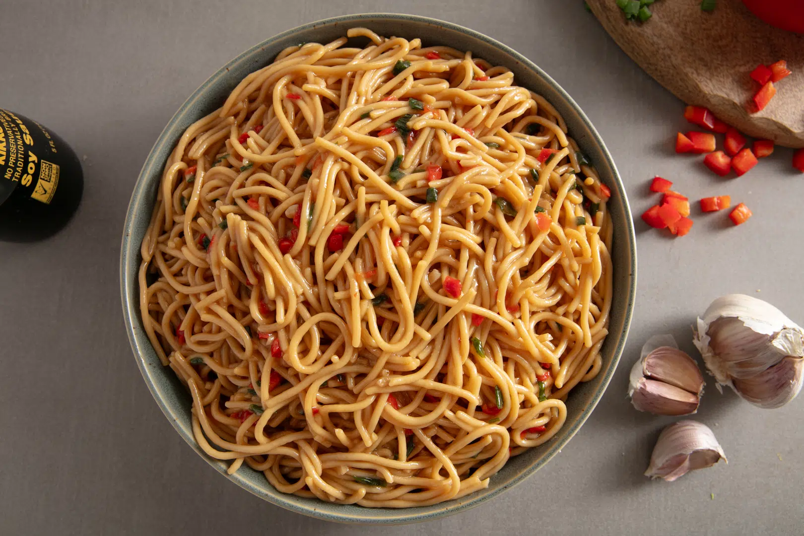 COOKED ENRICHED MACARONI PRODUCT (WATER, SEMOLINA [WHEAT], NIACIN, FERROUS SULFATE, THIAMIN MONONITRATE, RIBOFLAVIN, FOLIC ACID), RICE VINEGAR, SOY SAUCE (WATER, SOYBEANS, WHEAT, SALT), SOYBEAN OIL, RED BELL PEPPERS, SUGAR, GREEN ONIONS, CONTAINS LESS THAN 2% OF GARLIC, SESAME OIL, SPICES, POTASSIUM SORBATE (TO PREVENT SPOILAGE), XANTHAN GUM.