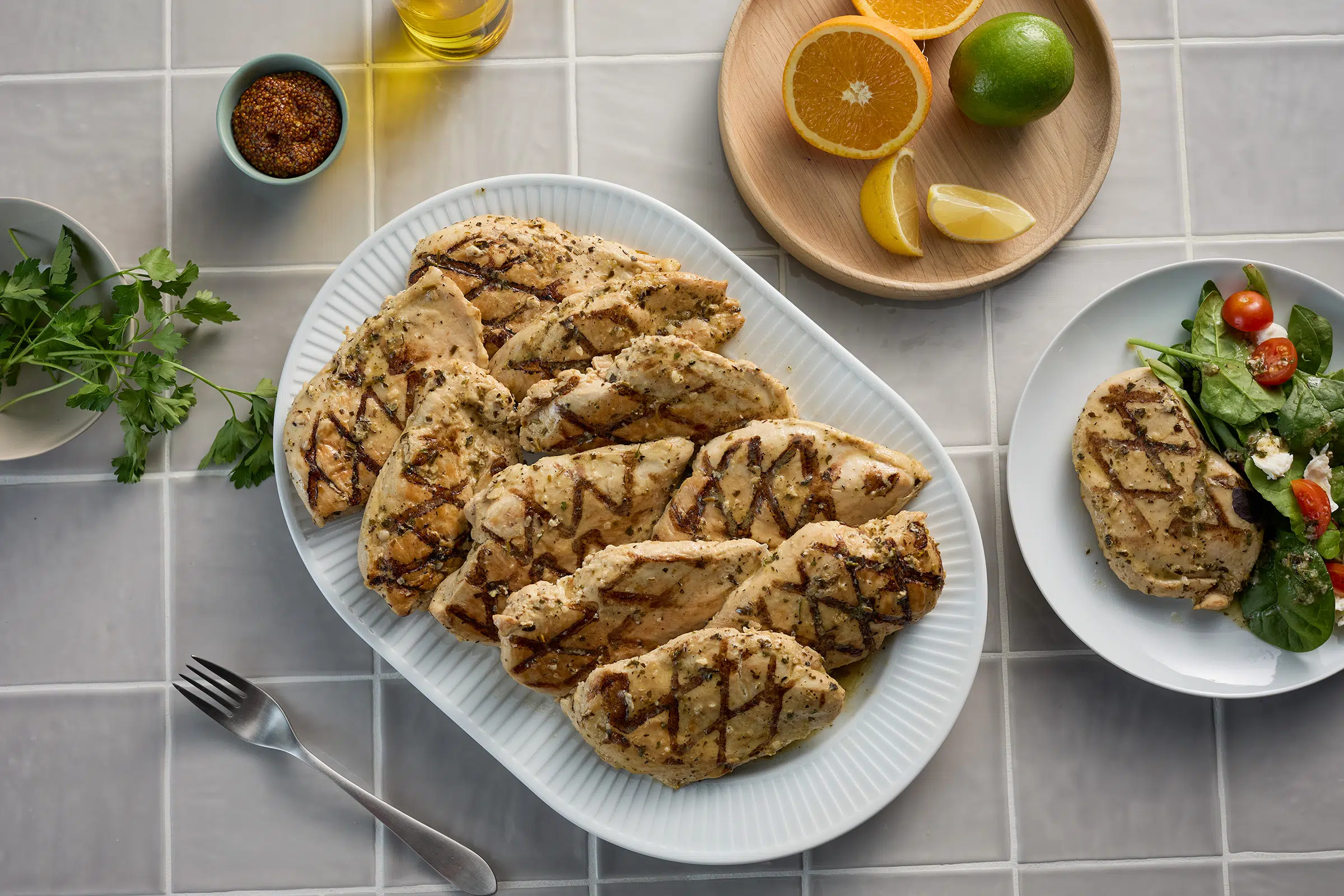 COOKED CHICKEN BREAST WITH RIB MEAT, WATER, CANOLA OIL, EXTRA VIRGIN OLIVE OIL, ORANGE PUREE (CONCENTRATED ORANGE JUICE, WATER, CONCENTRATED TANGERINE JUICE, ORANGE PULP CELLS, WHOLE GROUND ORANGES AND ORANGE OIL), CONTAINS LESS THAN 2% OF CHICKEN BASE MARINADE (SALT, DEHYDRATED CHICKEN BROTH, RICE STARCH, YEAST EXTRACT, SAFFLOWER OIL, NATURAL FLAVORS, RENDERED CHICKEN FAT, SOYBEAN OIL, CANOLA OIL, EXTRACTIVE OF CARROT [COLOR]), SPICES, DIJON MUSTARD (DISTILLED VINEGAR, WATER, MUSTARD SEED, SALT, WHITE WINE, CITRIC ACID, TARTARIC ACID, SPICES), GARLIC, LEMON JUICE, LIME JUICE, SALT, DRIED ONION, XANTHAN GUM.