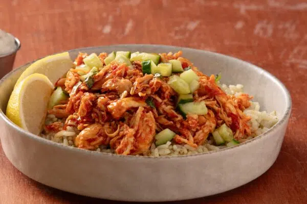 This bowl starts with a bed of our fragrant Cilantro Lime Rice topped with our tender, Pulled Rotisserie Chicken, which is tossed in an authentic, smoky Harissa paste. Commonly used in Moroccan and Tunisian cuisine, Harissa chili paste is known for its deep, complex heat and robust spice blend that is perfectly balanced with cooling diced cucumber and finished with a sprinkling of fresh cilantro and a squeeze of lemon. This bowl is an exhilarating, healthy, and satisfying global option that will have your holiday guests reaching for more.