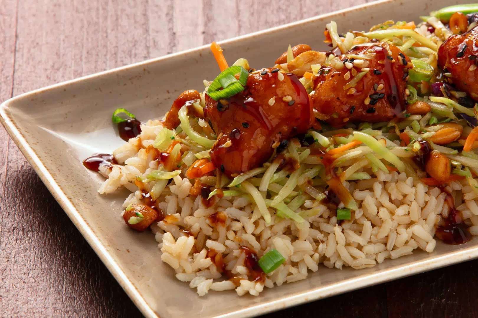 Enjoy our General Tso’s Cauliflower Bowl! This dish features crispy battered cauliflower coated in a sweet and spicy General Tso’s sauce. It’s served with brown rice and topped with fresh green onions and sesame seeds for a flavorful and satisfying meal.