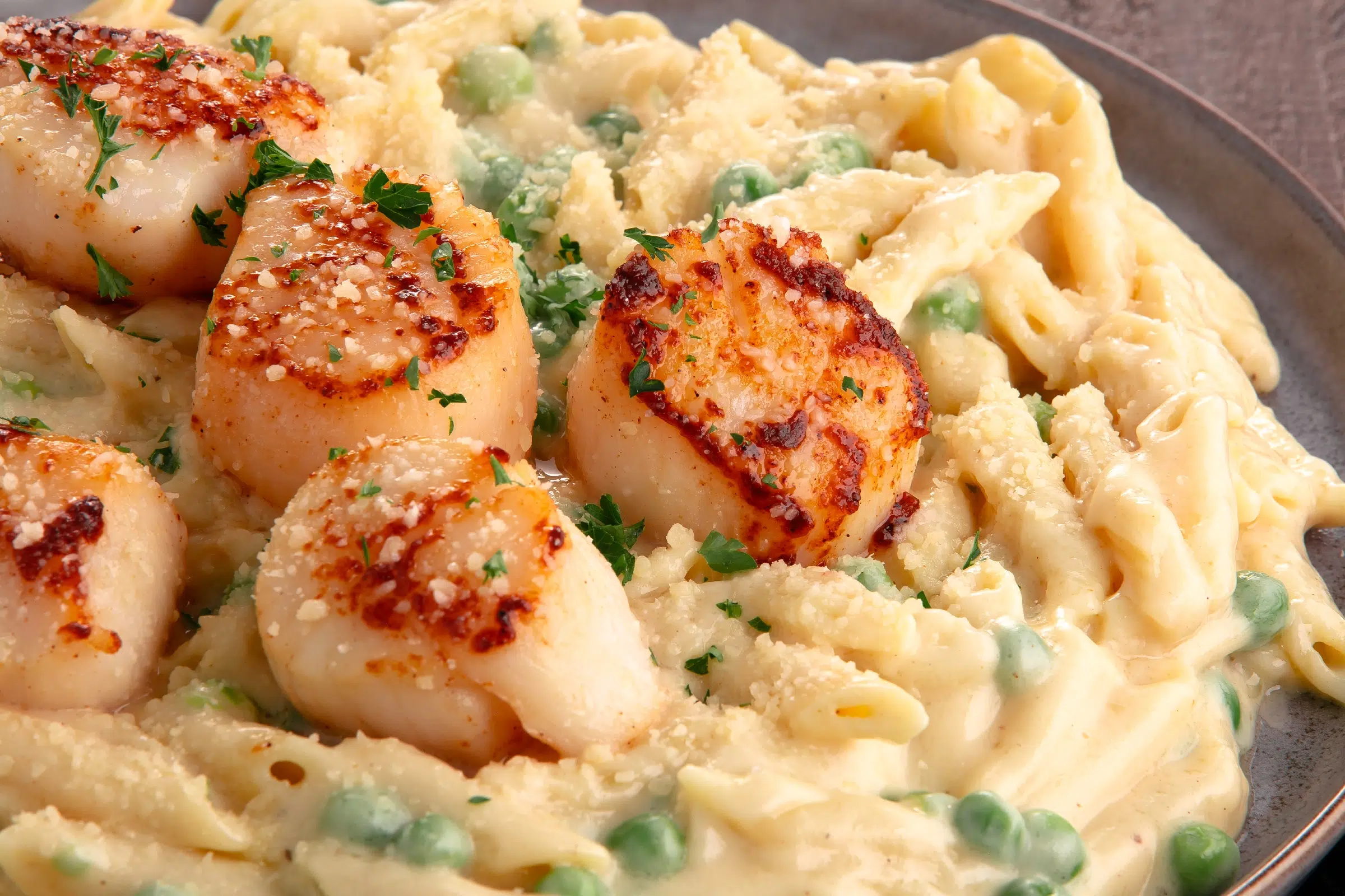 Succulent scallops are perfectly seared and tossed with al dente Tavolini penne in a rich and fragrant brown butter Alfredo sauce with a hint of garlic. Sweet peas add a pop of color and freshness, while fresh Parmesan and parsley complete this elegant meal.