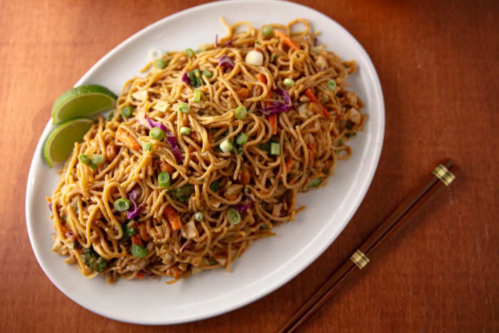 Enjoy this Thai-inspired, Southeast Asian Noodle Salad, a perfect light meal or side dish. This flavorful dish features Tavolini Spaghetti, crisp broccoli slaw, and a tantalizing blend of creamy peanut butter, soy sauce, and Sriracha sauce. Topped with roasted peanuts and fresh parsley, this noodle salad is a unique blend that customers will love.