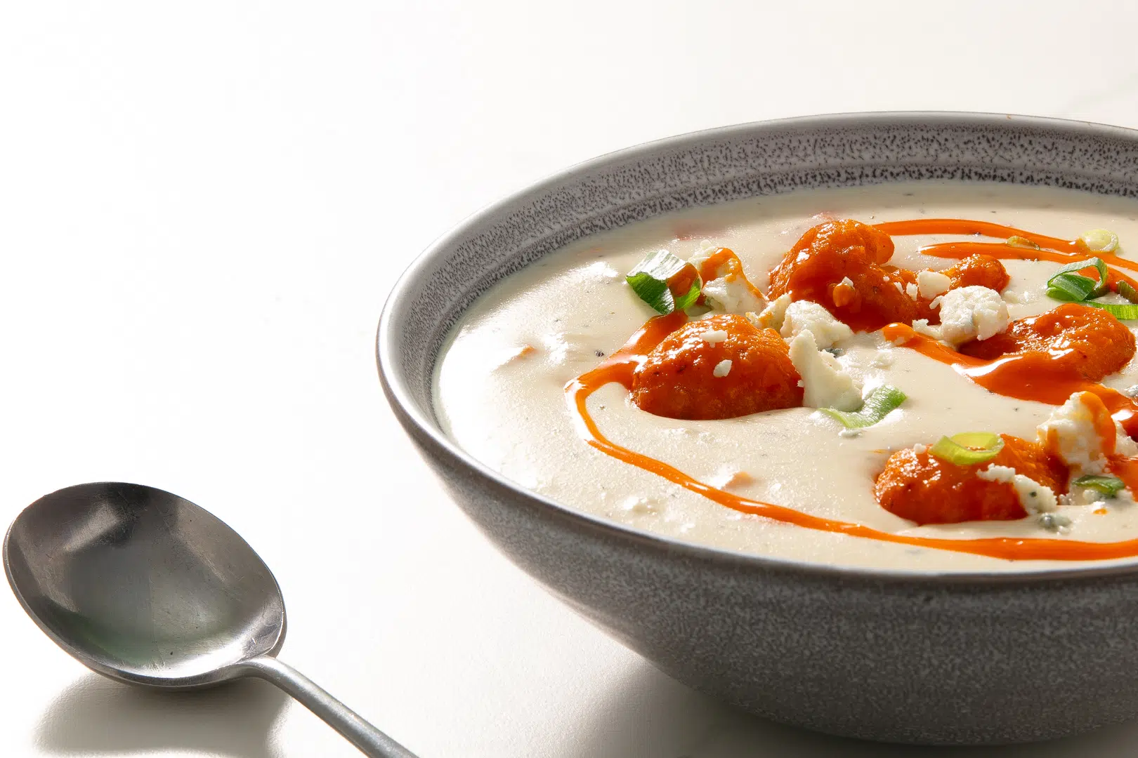 Spice things up with our Buffalo Cauliflower Soup! This creamy soup features cauliflower soup infused with zesty buffalo wing sauce. It’s topped with crispy, battered cauliflower and fresh green onions for a warm and satisfying kick.