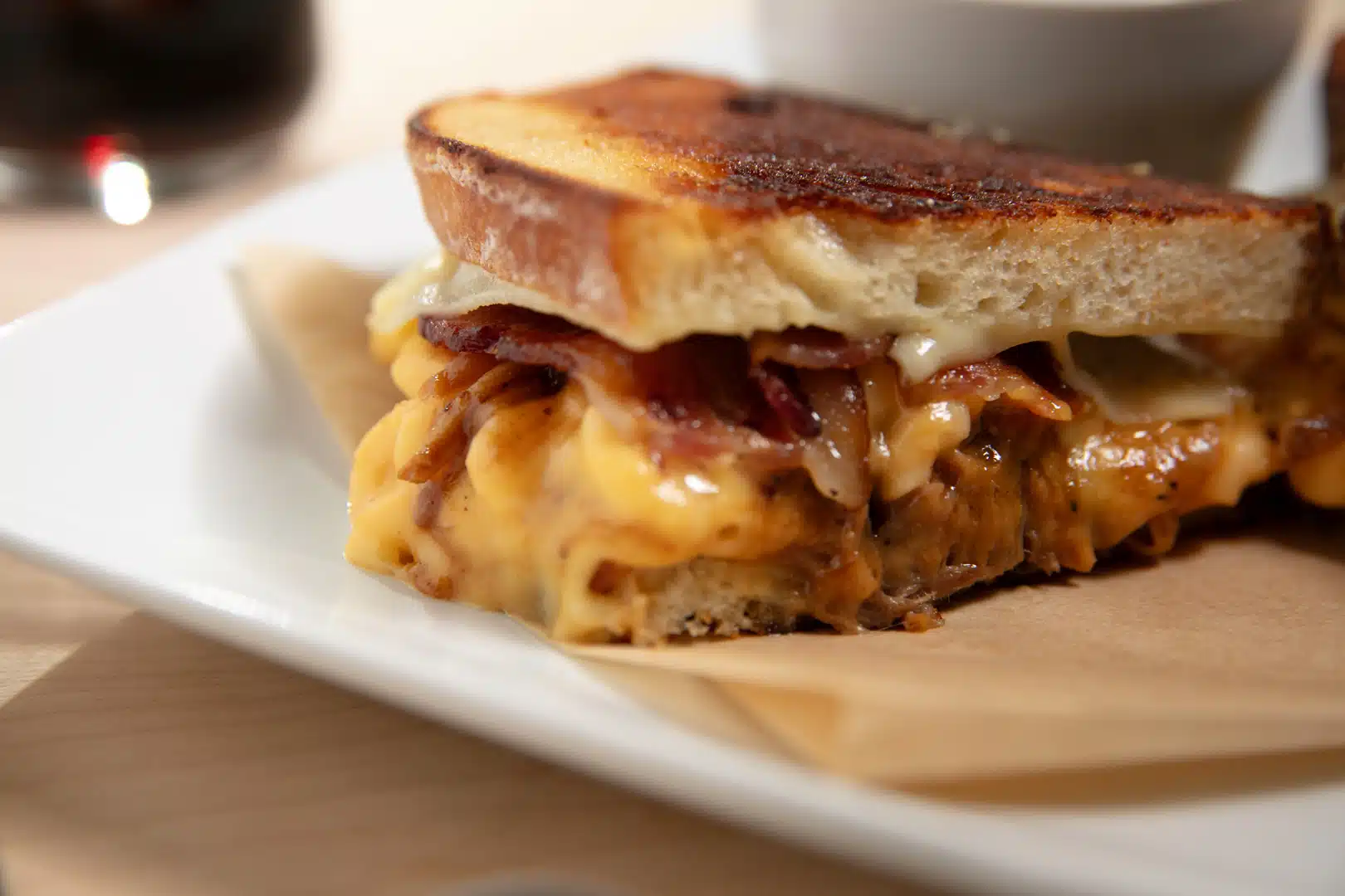 Discover our delicious Grilled Mac & Cheese Sandwich! This flavorful creation features Brickman’s creamy Homestyle Yellow Mac & Cheese layered with savory BBQ Pulled Pork, melted Havarti cheese, and crispy candied bacon, all grilled to golden perfection on sourdough bread for a delightfully creative meal experience.