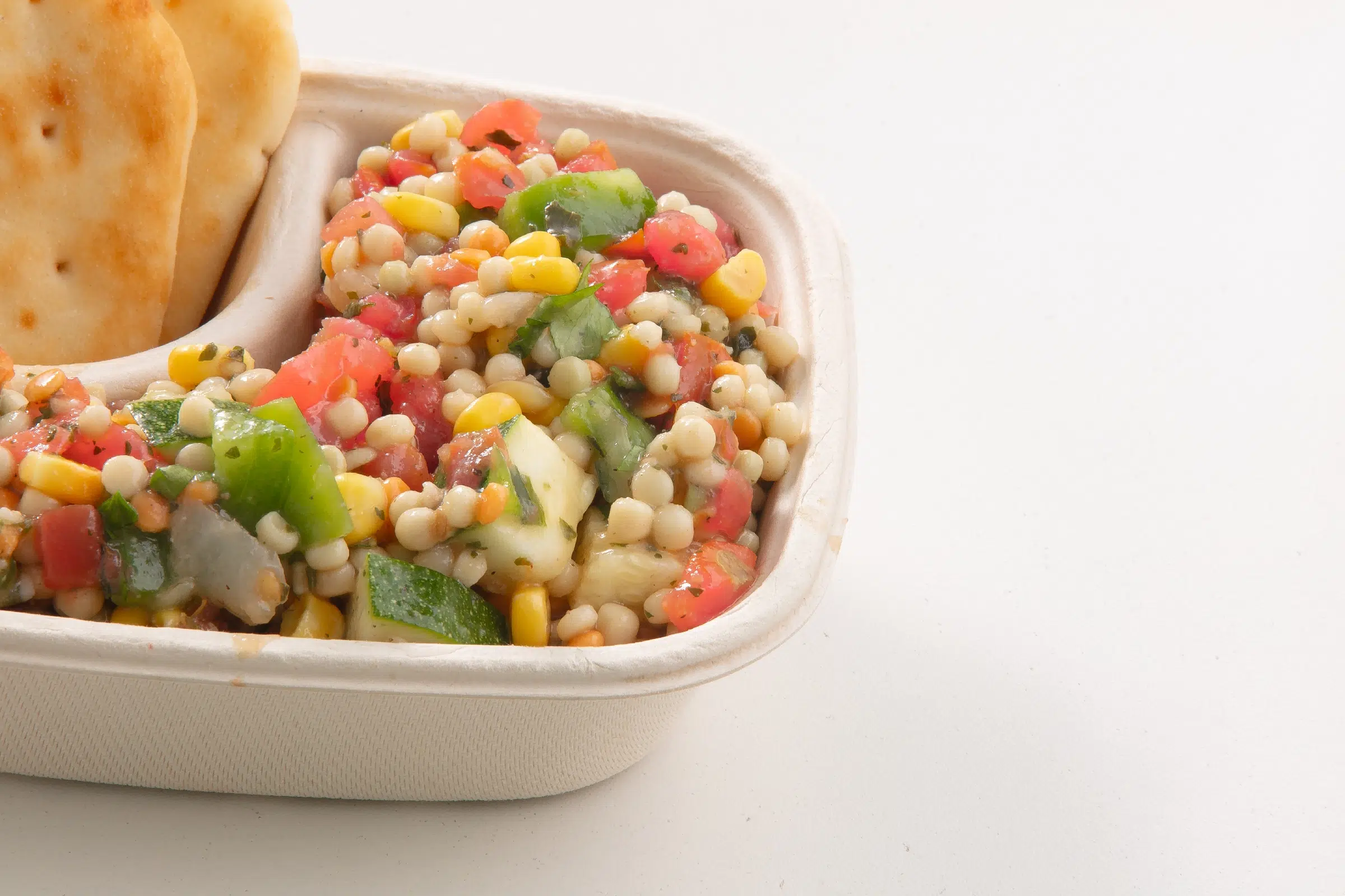 Our Farmer’s Market Bruschetta brings garden-fresh taste to your K-12 cafeteria. We mix light tomato basil couscous with colorful diced zucchini, sweet corn, crisp green peppers, and onion. Finished with fresh basil, it’s a simple, healthy way to help students eat more veggies with a versatile dish they’ll love!