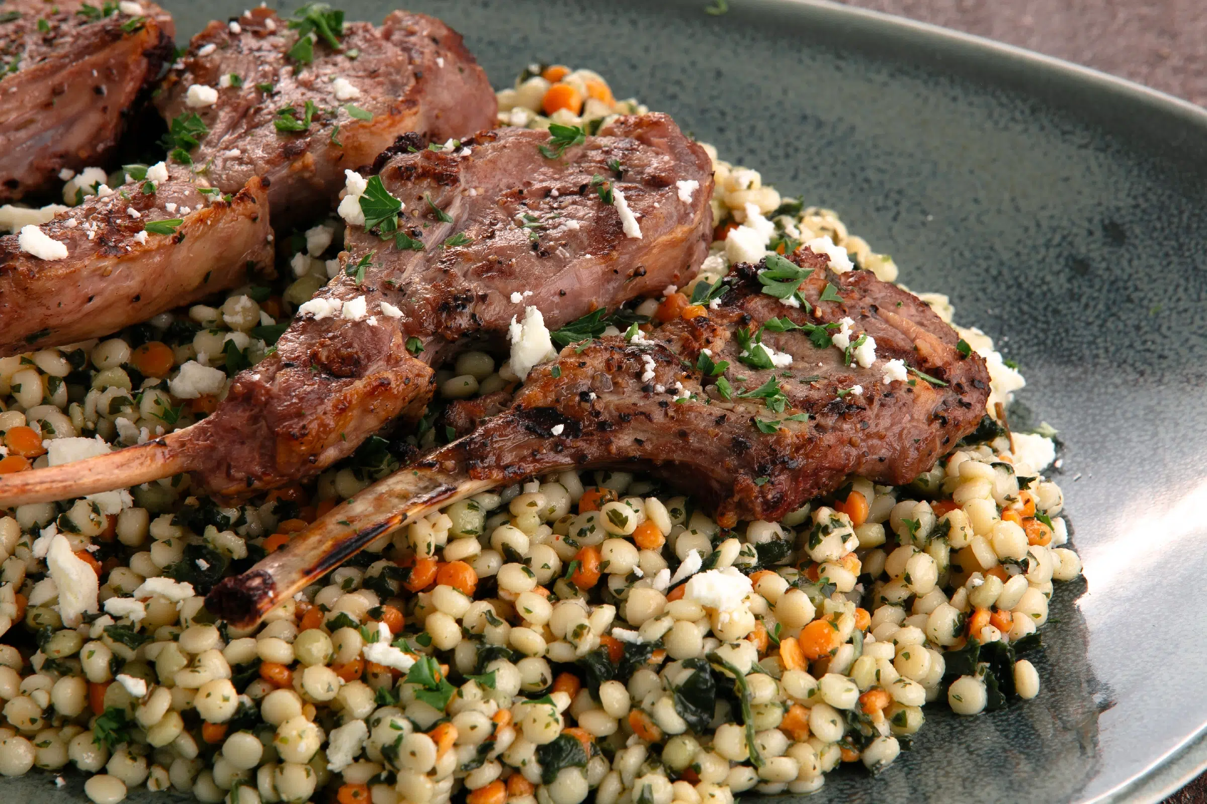 Savor our tender Lamb Lollipops, perfectly cooked and bursting with flavor. This delightful dish is served alongside vibrant Feta Mint Couscous and zesty Greek lemon & garlic potatoes. Warm naan bread and refreshing tzatziki sauce complete this authentic Mediterranean-inspired meal, offering a delightful combination of savory and fresh notes.