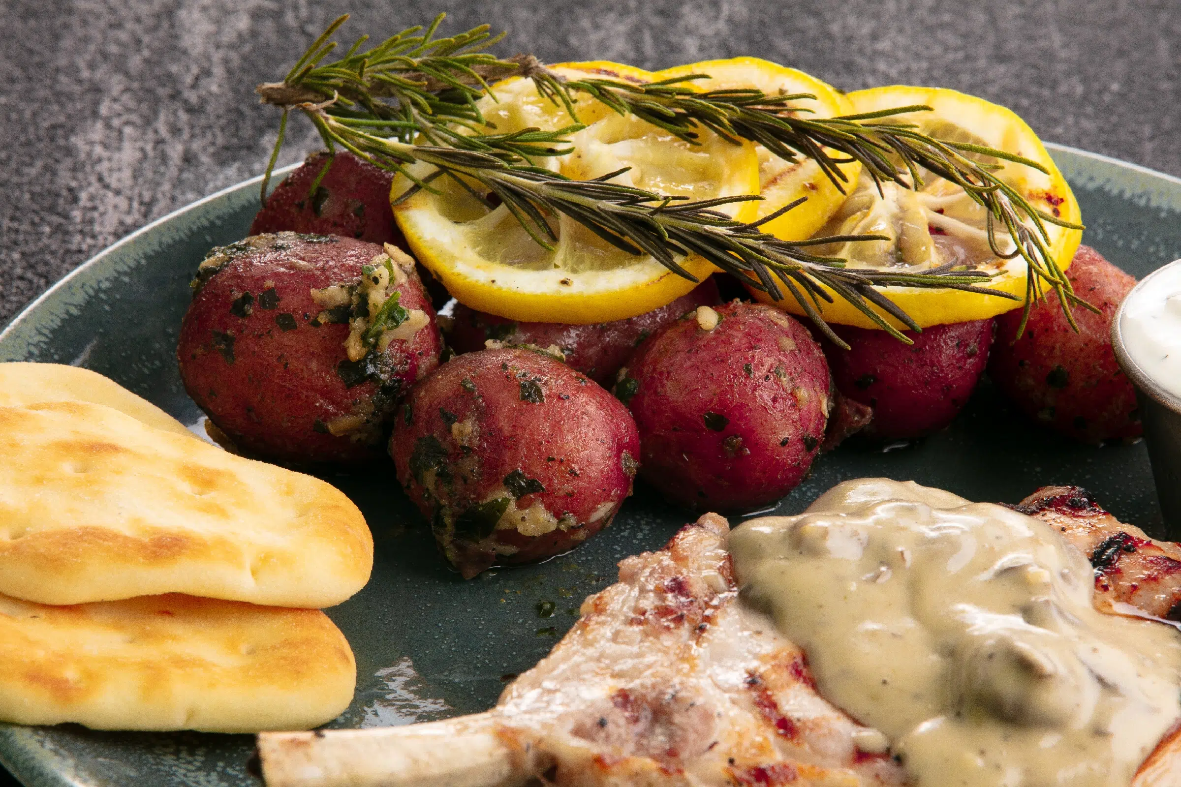 Enjoy our Grilled Pork Chops with Mushroom Sauce and Greek Seasoned Potatoes. Tender pork chops are covered in our rich, garlic-infused, mushroom and Alfredo sauces, while the Greek-seasoned potatoes come loaded with lemon, rosemary, feta, and cool tzatziki. It’s served with naan bread for a wonderfully satisfying meal.