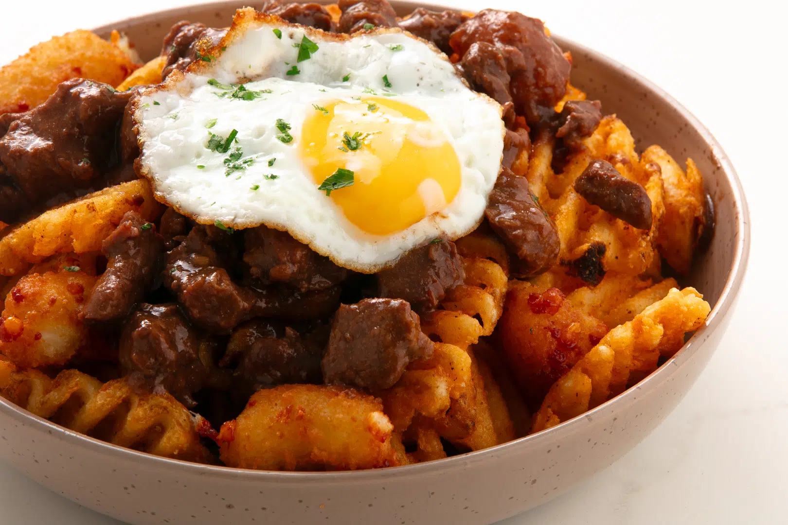 Dig into our Classic Beef Tip Poutine! This hearty dish features crispy waffle fries loaded with tender sous vide beef tips and squeaky breaded white cheddar cheese curds. It’s finished with fresh parsley for a rich and satisfying meal.