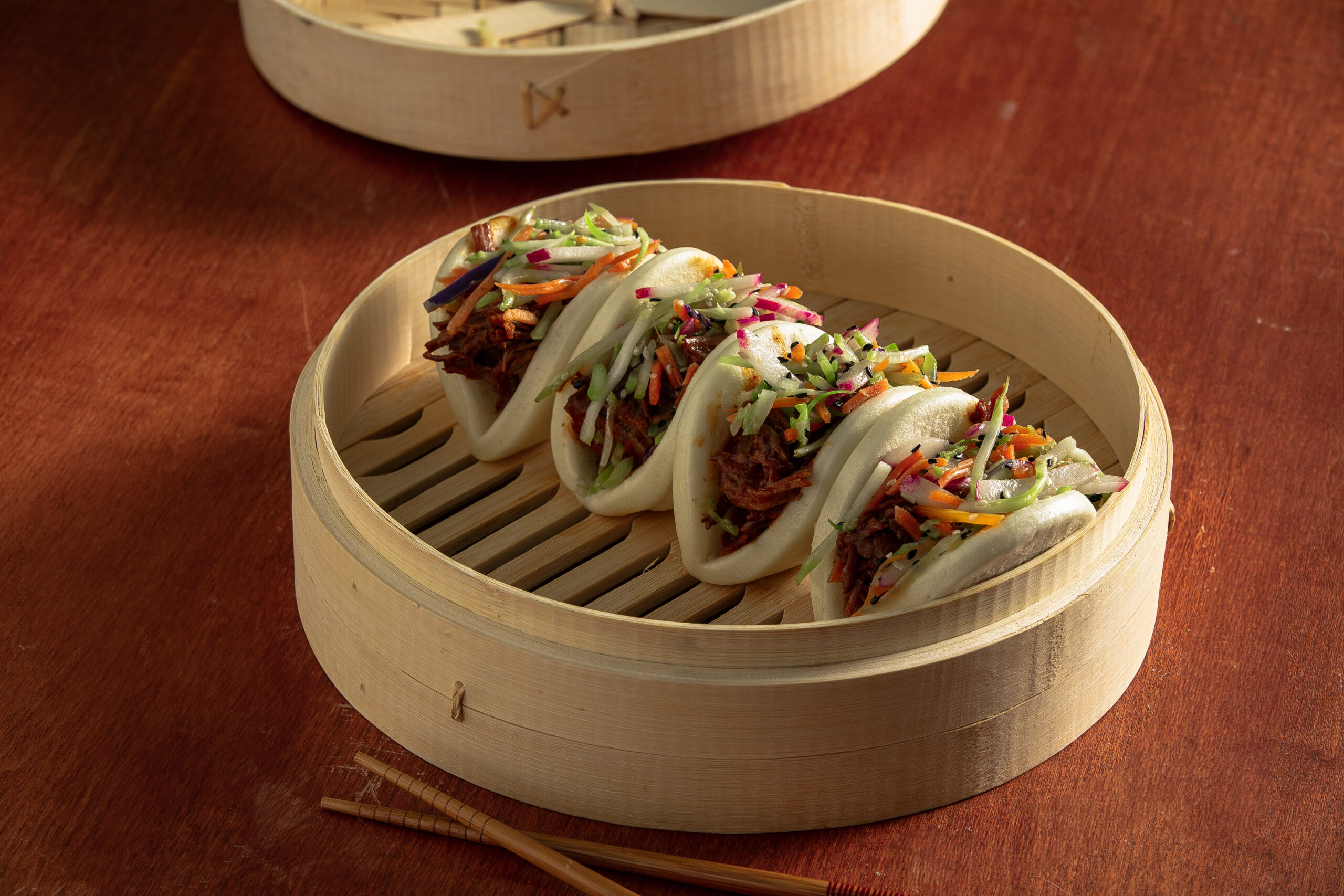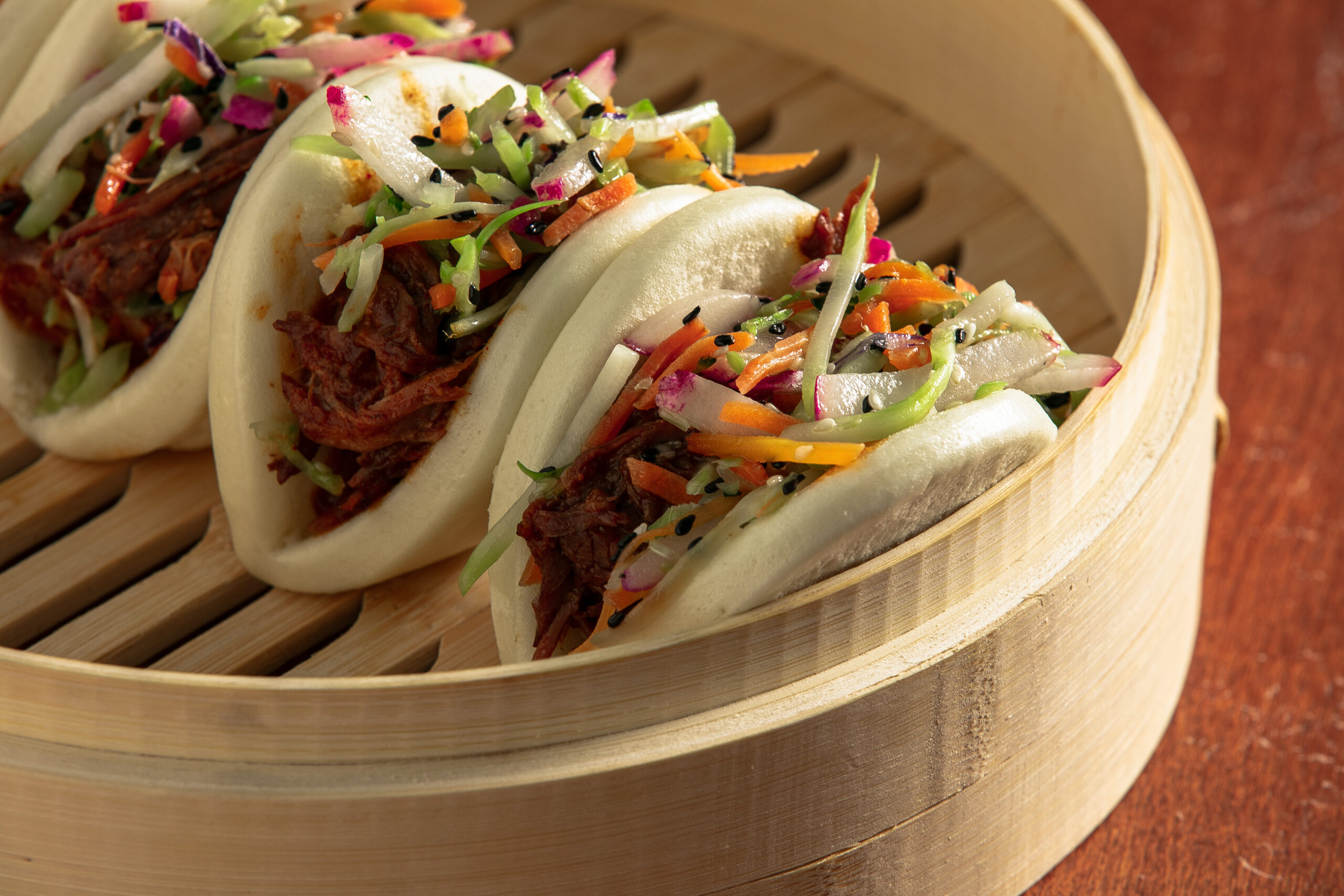 Experience pot roast like never before with our Gochujang Pot Roast Bao Buns! This extraordinary dish features tender Sandridge pot roast, infused with the bold flavors of Gochujang paste. Served in pillowy soft bao buns and topped with a vibrant slaw, matchstick vegetables, and a tantalizing soy-ginger-honey glaze to deliver a tantalizing blend of textures and tastes.