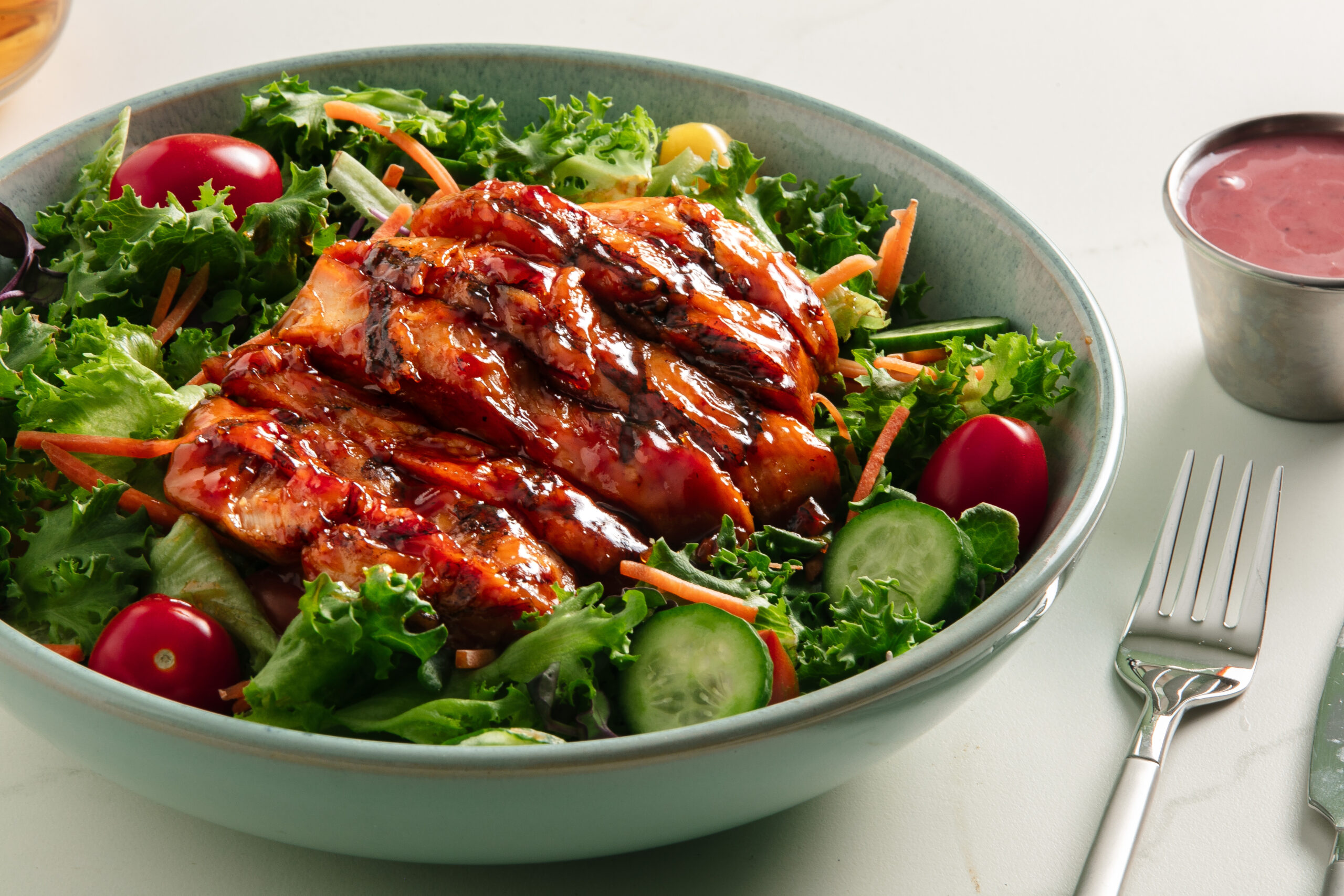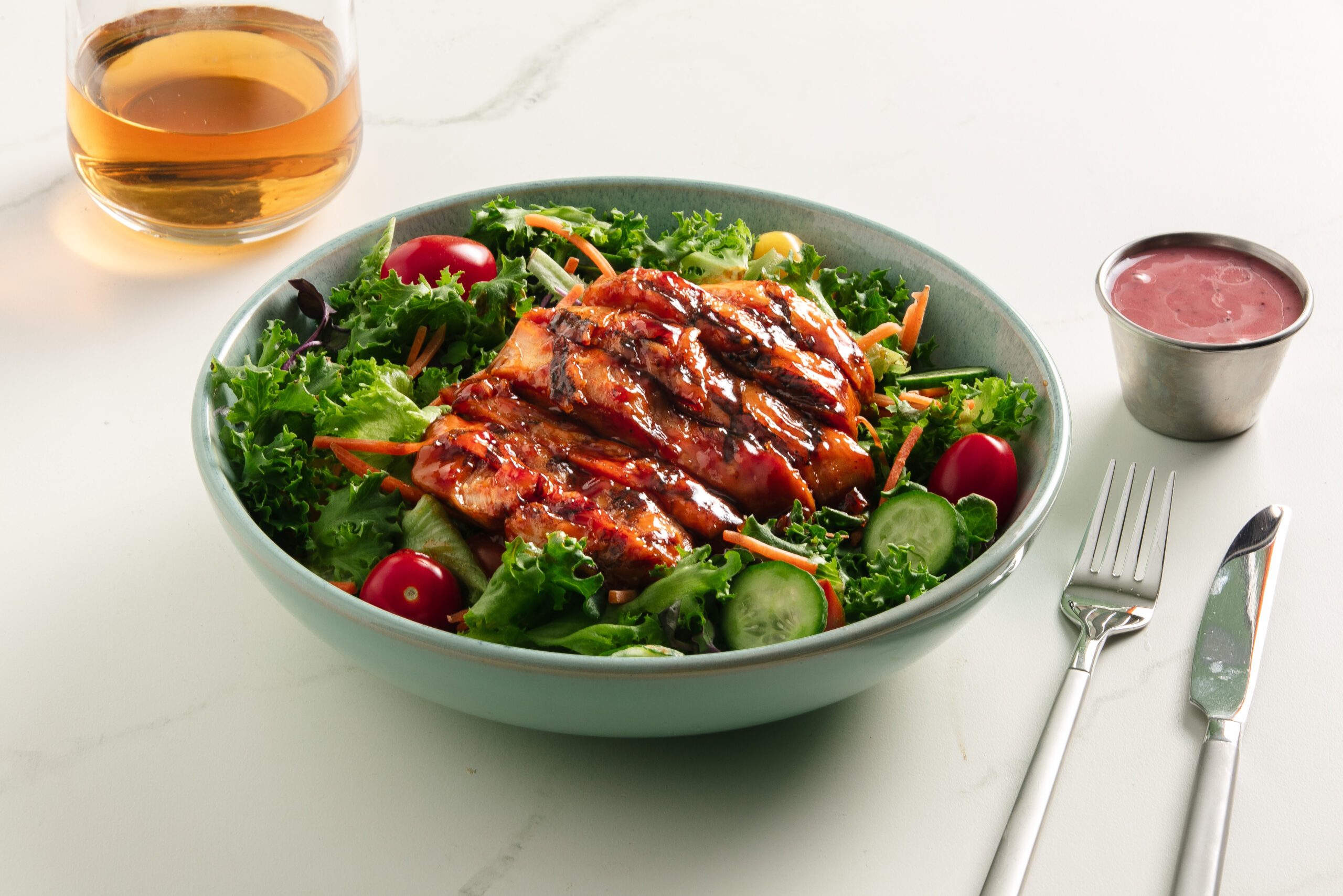 Transport your taste buds to paradise with our Guava BBQ Rum Glazed Chicken Salad. This vibrant salad features perfectly grilled chicken breast, glazed with a tantalizing blend of guava, BBQ sauce, and rum. Served over a colorful mix of crisp lettuce and fresh vegetables, with a side of strawberry vinaigrette to complete this tropical culinary creation.