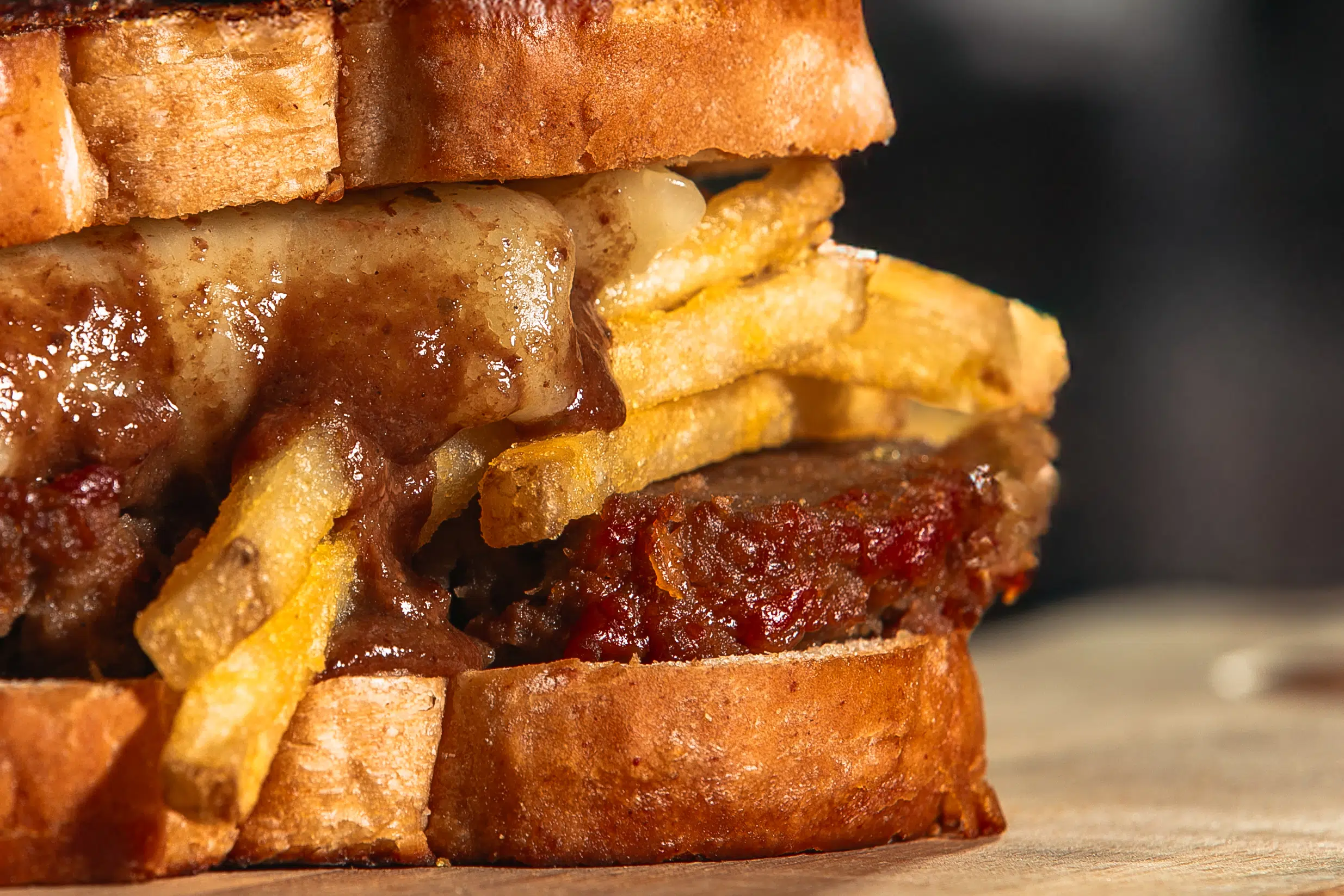 Enjoy a Canadian-inspired comfort food with our Poutine Meatloaf Sandwich! This delectable creation combines the hearty goodness of meatloaf with the classic poutine elements of fresh cheese curds, crispy French fries, and rich, flavorful gravy, all nestled between slices of perfectly toasted bread. It’s a culinary masterpiece that will have you saying ‘Oh, so good!’ with every bite.